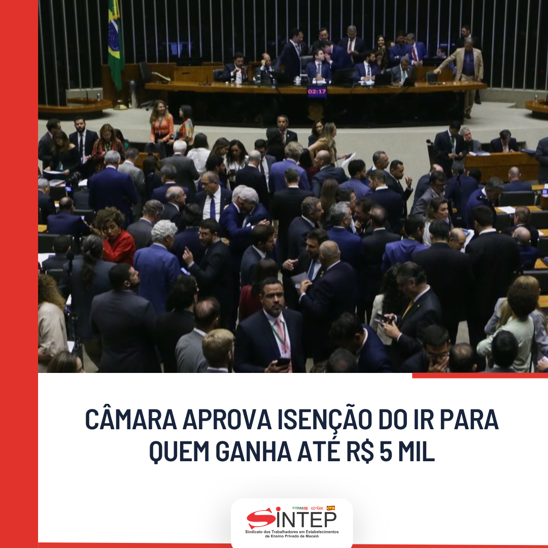A Câmara dos Deputados aprovou nesta quarta-feira (1º), com 493 votos favoráveis e nenhum contrário, o texto-base do projeto de Lei (PL) 1.087/2025, que prevê isenção de Imposto de Renda (IR) para pessoas físicas com renda mensal de até R$ 5 mil e desconto para quem ganha até R$ 7.350 mensais.