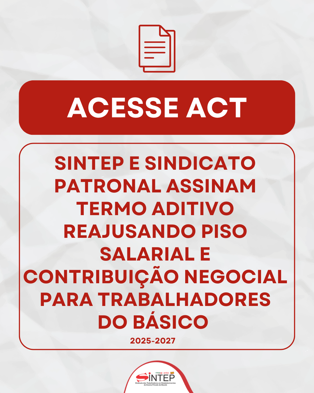 Sintep e sindicato patronal assinam termo aditivo reajustando piso salarial e contribuição negocial para trabalhadores do básico Há 10 segundos CompartilharTwitterFacebookTumblrE-mail O documento foi firmando entre os sindicatos (Sintep e Sinepe-básico) no fim de abril e tem validade até 2027. SINEPE-BASICO_ASSINADO-29-04-2026Baixar Diga-nos O que você pensa0Like0Love0Haha0Wow0Sad0Angry Compartilhar este post: